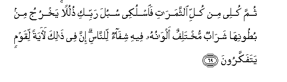 69. Thumma kulee min kulli alththamarati faoslukee subula rabbiki thululan yakhruju min butooniha sharabun mukhtalifun alwanuhu feehi shifaon lilnnasi inna fee thalika laayatan liqawmin yatafakkaroona