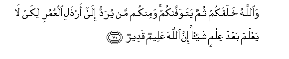 70. WaAllahu khalaqakum thumma yatawaffakum waminkum man yuraddu ila arthali alAAumuri likay la yaAAlama baAAda AAilmin shay-an inna Allaha AAaleemun qadeerun