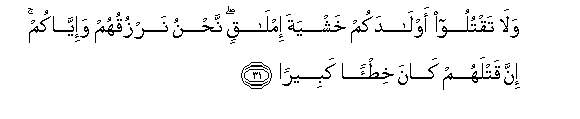 31. Wala taqtuloo awladakum khashyata imlaqin nahnu narzuquhum wa-iyyakum inna qatlahum kana khit-an kabeeran