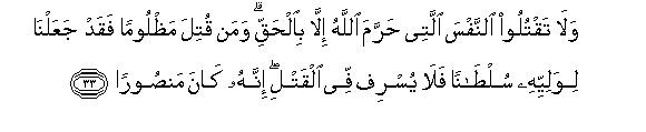 33. Wala taqtuloo alnnafsa allatee harrama Allahu illa bialhaqqi waman qutila mathlooman faqad jaAAalna liwaliyyihi sultanan fala yusrif fee alqatli innahu kana mansooran