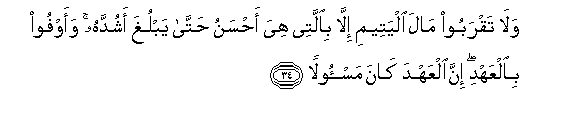 34. Wala taqraboo mala alyateemi illa biallatee hiya ahsanu hatta yablugha ashuddahu waawfoo bialAAahdi inna alAAahda kana mas-oolan