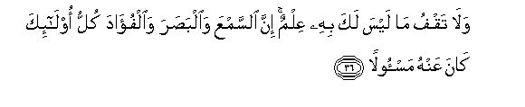 36. Wala taqfu ma laysa laka bihi AAilmun inna alssamAAa waalbasara waalfu-ada kullu ola-ika kana AAanhu mas-oolan
