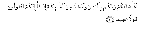 40. Afaasfakum rabbukum bialbaneena waittakhatha mina almala-ikati inathan innakum lataqooloona qawlan AAatheeman