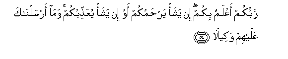 54. Rabbukum aAAlamu bikum in yasha/ yarhamkum aw in yasha/ yuAAaththibkum wama arsalnaka AAalayhim wakeelan