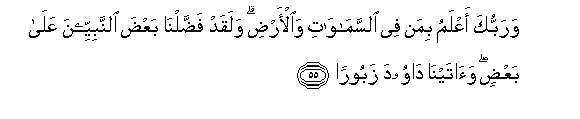 55. Warabbuka aAAlamu biman fee alssamawati waal-ardi walaqad faddalna baAAda alnnabiyyeena AAala baAAdin waatayna dawooda zabooran
