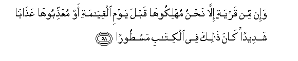 58. Wa-in min qaryatin illa nahnu muhlikooha qabla yawmi alqiyamati aw muAAaththibooha AAathaban shadeedan kana thalika fee alkitabi mastooran