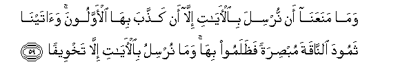 59. Wama manaAAana an nursila bial-ayati illa an kaththaba biha al-awwaloona waatayna thamooda alnnaqata mubsiratan fathalamoo biha wama nursilu bial-ayati illa takhweefan