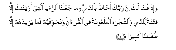 60. Wa-ith qulna laka inna rabbaka ahata bialnnasi wama jaAAalna alrru/ya allatee araynaka illa fitnatan lilnnasi waalshshajarata almalAAoonata fee alqur-ani wanukhawwifuhum fama yazeeduhum illa tughyanan kabeeran