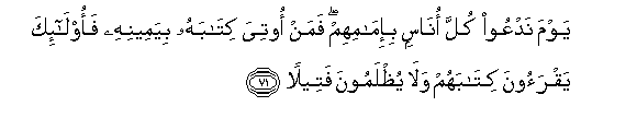 71. Yawma nadAAoo kulla onasin bi-imamihim faman ootiya kitabahu biyameenihi faola-ika yaqraoona kitabahum wala yuthlamoona fateelan