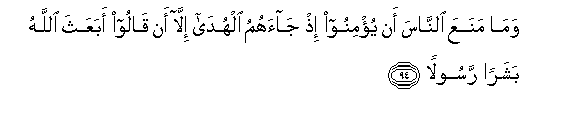 94. Wama manaAAa alnnasa an yu/minoo ith jaahumu alhuda illa an qaloo abaAAatha Allahu basharan rasoolan