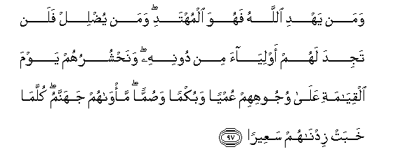 97. Waman yahdi Allahu fahuwa almuhtadi waman yudlil falan tajida lahum awliyaa min doonihi wanahshuruhum yawma alqiyamati AAala wujoohihim AAumyan wabukman wasumman ma/wahum jahannamu kullama khabat zidnahum saAAeeran