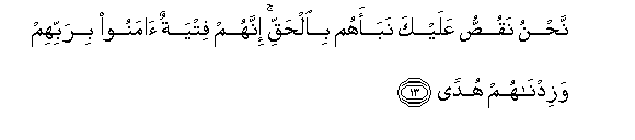 13. Nahnu naqussu AAalayka nabaahum bialhaqqi innahum fityatun amanoo birabbihim wazidnahum hudan