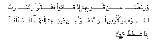 14. We gave strength to their hearts: Behold, they stood up and said: "Our Lord is the Lord of the heavens and of the earth: never shall we call upon any god other than Him: if we did, we should indeed have uttered an enormity!