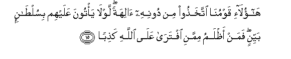 15. Haola-i qawmuna ittakhathoo min doonihi alihatan lawla ya/toona AAalayhim bisultanin bayyinin faman athlamu mimmani iftara AAala Allahi kathiban
