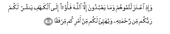 16. Wa-ithi iAAtazaltumoohum wama yaAAbudoona illa Allaha fa/woo ila alkahfi yanshur lakum rabbukum min rahmatihi wayuhayyi/ lakum min amrikum mirfaqan