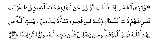 17. Watara alshshamsa itha talaAAat tazawaru AAan kahfihim thata alyameeni wa-itha gharabat taqriduhum thata alshshimali wahum fee fajwatin minhu thalika min ayati Allahi man yahdi Allahu fahuwa almuhtadi waman yudlil falan tajida lahu waliyyan murshidan