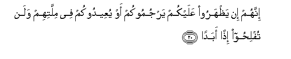 20. Innahum in yathharoo AAalaykum yarjumookum aw yuAAeedookum fee millatihim walan tuflihoo ithan abadan