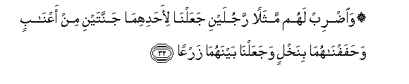 32. Set forth to them the parable of two men: for one of them We provided two gardens of grape-vines and surrounded them with date palms; in between the two We placed corn-fields.