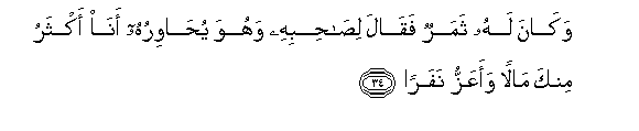 34. Wakana lahu thamarun faqala lisahibihi wahuwa yuhawiruhu ana aktharu minka malan waaAAazzu nafaran