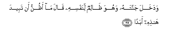 35. Wadakhala jannatahu wahuwa thalimun linafsihi qala ma athunnu an tabeeda hathihi abadan