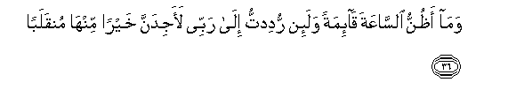 36. "Nor do I deem that the Hour (of Judgment) will (ever) come: Even if I am brought back to my Lord, I shall surely find (there) something better in exchange."