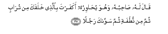 37. Qala lahu sahibuhu wahuwa yuhawiruhu akafarta biallathee khalaqaka min turabin thumma min nutfatin thumma sawwaka rajulan