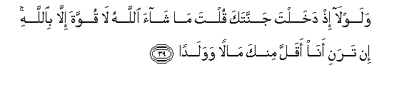 39. Walawla ith dakhalta jannataka qulta ma shaa Allahu la quwwata illa biAllahi in tarani ana aqalla minka malan wawaladan