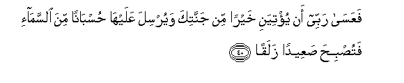 40. FaAAasa rabbee an yu/tiyani khayran min jannatika wayursila AAalayha husbanan mina alssama-i fatusbiha saAAeedan zalaqan