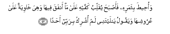 42. Waoheeta bithamarihi faasbaha yuqallibu kaffayhi AAala ma anfaqa feeha wahiya khawiyatun AAala AAurooshiha wayaqoolu ya laytanee lam oshrik birabbee ahadan