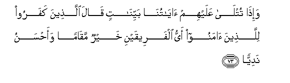 73. Wa-itha tutla AAalayhim ayatuna bayyinatin qala allatheena kafaroo lillatheena amanoo ayyu alfareeqayni khayrun maqaman waahsanu nadiyyan