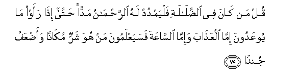 75. Qul man kana fee alddalalati falyamdud lahu alrrahmanu maddan hatta itha raaw ma yooAAadoona imma alAAathaba wa-imma alssaAAata fasayaAAlamoona man huwa sharrun makanan waadAAafu jundan