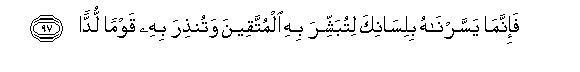 97. Fa-innama yassarnahu bilisanika litubashshira bihi almuttaqeena watunthira bihi qawman luddan