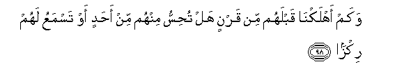 98. Wakam ahlakna qablahum min qarnin hal tuhissu minhum min ahadin aw tasmaAAu lahum rikzan