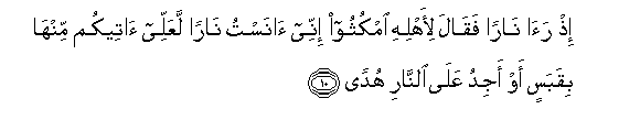 10. Ith raa naran faqala li-ahlihi omkuthoo innee anastu naran laAAallee ateekum minha biqabasin aw ajidu AAala alnnari hudan