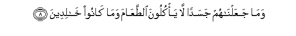 8. Wama jaAAalnahum jasadan la ya/kuloona alttaAAama wama kanoo khalideena