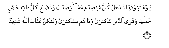 2. Yawma tarawnaha tathhalu kullu murdiAAatin AAamma ardaAAat watadaAAu kullu thati hamlin hamlaha watara alnnasa sukara wama hum bisukara walakinna AAathaba Allahi shadeedun
