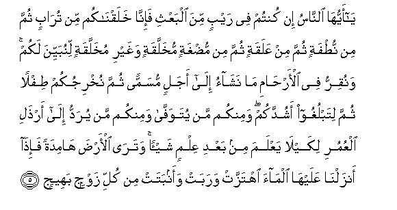 5. Ya ayyuha alnnasu in kuntum fee raybin mina albaAAthi fa-inna khalaqnakum min turabin thumma min nutfatin thumma min AAalaqatin thumma min mudghatin mukhallaqatin waghayri mukhallaqatin linubayyina lakum wanuqirru fee al-arhami ma nashao ila ajalin musamman thumma nukhrijukum tiflan thumma litablughoo ashuddakum waminkum man yutawaffa waminkum man yuraddu ila arthali alAAumuri likayla yaAAlama min baAAdi AAilmin shay-an watara al-arda hamidatan fa-itha anzalna AAalayha almaa ihtazzat warabat waanbatat min kulli zawjin baheejin