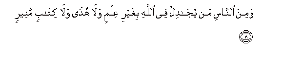 8. Wamina alnnasi man yujadilu fee Allahi bighayri AAilmin wala hudan wala kitabin muneerin