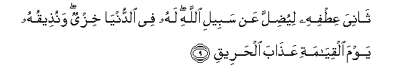 9. Thaniya AAitfihi liyudilla AAan sabeeli Allahi lahu fee alddunya khizyun wanutheequhu yawma alqiyamati AAathaba alhareeqi