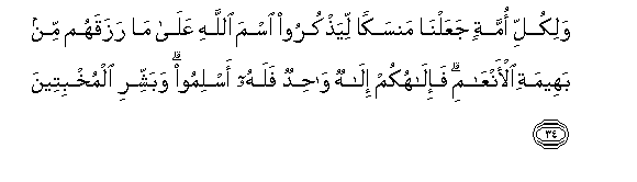 34. Walikulli ommatin jaAAalna mansakan liyathkuroo isma Allahi AAala ma razaqahum min baheemati al-anAAami fa-ilahukum ilahun wahidun falahu aslimoo wabashshiri almukhbiteena