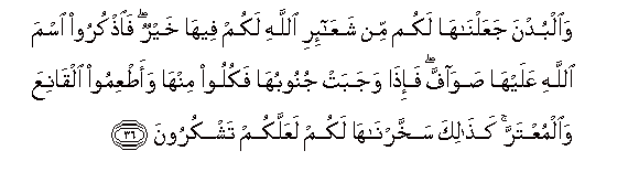 36. Waalbudna jaAAalnaha lakum min shaAAa-iri Allahi lakum feeha khayrun faothkuroo isma Allahi AAalayha sawaffa fa-itha wajabat junoobuha fakuloo minha waatAAimoo alqaniAAa waalmuAAtarra kathalika sakhkharnaha lakum laAAallakum tashkuroona