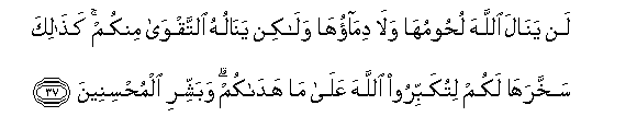 37. Lan yanala Allaha luhoomuha wala dimaoha walakin yanaluhu alttaqwa minkum kathalika sakhkharaha lakum litukabbiroo Allaha AAala ma hadakum wabashshiri almuhsineena