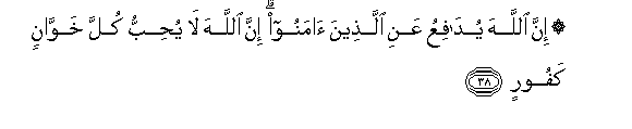 38. Inna Allaha yudafiAAu AAani allatheena amanoo inna Allaha la yuhibbu kulla khawwanin kafoorin