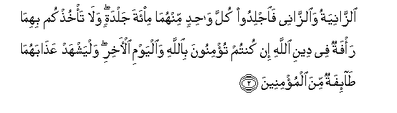 2. Alzzaniyatu waalzzanee faijlidoo kulla wahidin minhuma mi-ata jaldatin wala ta/khuthkum bihima ra/fatun fee deeni Allahi in kuntum tu/minoona biAllahi waalyawmi al-akhiri walyashhad AAathabahuma ta-ifatun mina almu/mineena
