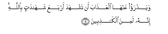 8. But it would avert the punishment from the wife, if she bears witness four times (with an oath) By Allah, that (her husband) is telling a lie;