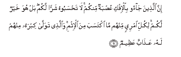 11. Inna allatheena jaoo bial-ifki AAusbatun minkum la tahsaboohu sharran lakum bal huwa khayrun lakum likulli imri-in minhum ma iktasaba mina al-ithmi waallathee tawalla kibrahu minhum lahu AAathabun AAatheemun