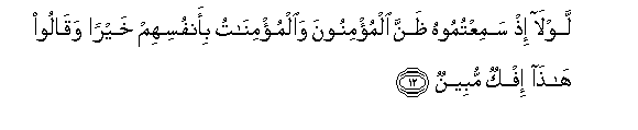 12. Lawla ith samiAAtumoohu thanna almu/minoona waalmu/minatu bi-anfusihim khayran waqaloo hatha ifkun mubeenun