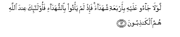 13. Lawla jaoo AAalayhi bi-arbaAAati shuhadaa fa-ith lam ya/too bialshshuhada-i faola-ika AAinda Allahi humu alkathiboona