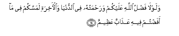 14. Walawla fadlu Allahi AAalaykum warahmatuhu fee alddunya waal-akhirati lamassakum fee ma afadtum feehi AAathabun AAatheemun