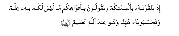 15. Ith talaqqawnahu bi-alsinatikum wataqooloona bi-afwahikum ma laysa lakum bihi AAilmun watahsaboonahu hayyinan wahuwa AAinda Allahi AAatheemun